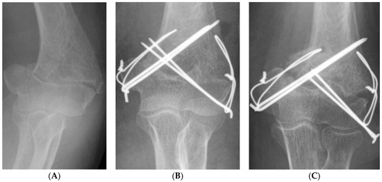 - Kokly, S.; Castagna, A.; Mohamadreza, M. Modified Tension Band Wiring in Adult Distal Humeral Fracture Types A2 and C1. Arch. Bone Jt. Surg. 2019, 7, 325–330. [Google Scholar] [PubMed]