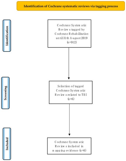 According to the methodology developed by the Cochrane Rehabilitation [], CSRs relevant to rehabilitation are continuously tagged to maintain an up-to-date database (https://rehabilitation.cochrane.org/evidence, accessed on 1 September 2019). We initially searched all CSRs related to TBI published between August 2009 and August 2019 and reported the results to the WHO. We subsequently searched the Cochrane Library to August 2021 to preserve the timeliness of evidence. Eligible CSRs included those assessing interventions for persons with TBI provided or prescribed by rehabilitation professionals [].