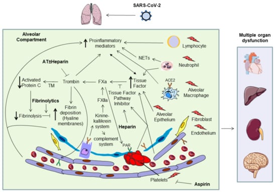 Injured endothelial cells release von Willebrand factor (vWF), that promote platelet aggregation, and Angiopoietin-2, which in turn binds its receptor Tie2 and abrogates Angiopoietin-1 binding, leading to vasoconstriction and tissue factor (TF) expression []. TF is also expressed on alveolar epithelial cells, macrophages/monocytes, neutrophils and platelets, and its activation leads to extrinsic coagulation cascade activation and fibrin formation [,]. In addition, proinflammatory cytokines are potent activators of TF through the transcription of NF-kB, a protective mechanism that pretends to limit blood loss and avoid the spreading of foreign particles from the initial point of infection. Activated neutrophils further enhance coagulation through the release of damage-associated molecular patterns (DAMPs) and neutrophil extracellular traps (NETs), composed of DNA, cytotoxic histones and neutrophils elastase, which accumulate in the microvessels of patients with severe COVID-19 and induce microthrombosis [] (Figure 1).