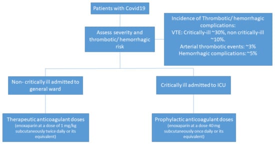 - Chandra, A.; Chakraborty, U.; Ghosh, S.; Dasgupta, S. Anticoagulation in COVID-19: Current concepts and controversies. Postgrad. Med. J. 2022, 98, 395–402. Available online: https://pmj.bmj.com/content/early/2021/04/12/postgradmedj-2021-139923 (accessed on 28 March 2022). [CrossRef]