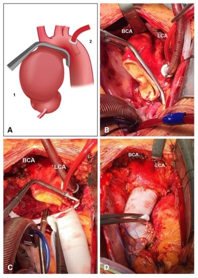 First, a conventional clamping is performed proximal to the brachiocephalic artery (BCA) (Figure 1A). Second, in cardiac arrest, aneurysmatic tissue is resected right below the clamp (at the level of the BCA) and at the sinotubular junction (STJ). Once the ascending aorta has been trimmed, the aortic arch should be mobilized dorsally by separating the aorta from the periaortic tissue. In this regard, it is of utmost importance to extend the distal preparation exposing zone 3 of the aorta. At this point, the Satinsky clamp can be safely placed in order to expose the lesser curvature for removal. This maneuver enables complete mobilization of the aortic arch under visual control. Third, a Satinsky clamp is then (under low-flow cardiopulmonary bypass) placed distal to the first clamp at the outflow of the brachiocephalic artery and transversal to the aortic arch allowing maximal removal of the lesser curvature (Figure 1B,C). Prosthesis size is determined according to the diameter of the sinotubular junction in case of a supracoronary replacement or to conduit size when aortic root is replaced. The selected prosthesis is trimmed and tailored for distal anastomosis leaving a prosthesis bevel for accommodation to the lesser curvature. After proximal arch resection the distal anastomosis is carried out by means of continuous 4-0 polypropylene suture using a periaortic Teflon felt strip. The proximal anastomosis was then tailored according to the necessity of concomitant procedures (i.e., composite graft implantation, aortic root reconstruction). BioGlue® (CryoLife, Inc., Kennesaw, GA, USA) was applied for sealing of the suture line (Figure 1D).
