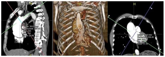 Based on ECG-gated computed tomography angiograms (CTAs) biplanar measurements at the level of the sinotubular junction (STJ) and immediately proximal to the origin of the brachiocephalic artery (BCA), the supposed position of the clamp, have been performed. Exemplary biplanar measurement with automated 3D reconstruction is displayed in Figure 2. According to the data, a suggested reference value for suitable diameter size of the respected levels of aneurysmatic aorta for the application of our institutional method of transversal arch clamping was evaluated.