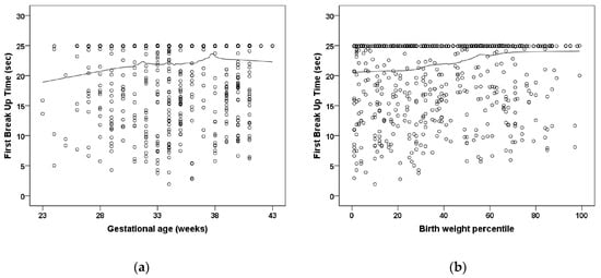 Relationship of (a) gestational age and (b) birth weight percentile to the first break-up time (sec.) in the Gutenberg Prematurity Eye Study. Figure legend 1: There is no significant association between low gestational age and low birth weight percentile with first break-up time. The line presents the Loess (Locally Weighted Scatterplot Smoothing) curve.