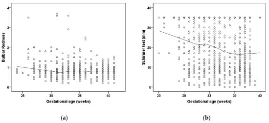The measurement in the Schirmer test was associated with GA (p < 0.001), birth weight (<0.001), and placental insufficiency (p = 0.029) in univariable analyses. In multivariable model #1, the Schirmer test results were still associated with gestational age (B = −0.692 [95% CI: −1.158; −0.226] mm; p = 0.003) and placental insufficiency (B = 8.596 [95% CI: 4.643; 12.55] mm; p < 0.001).