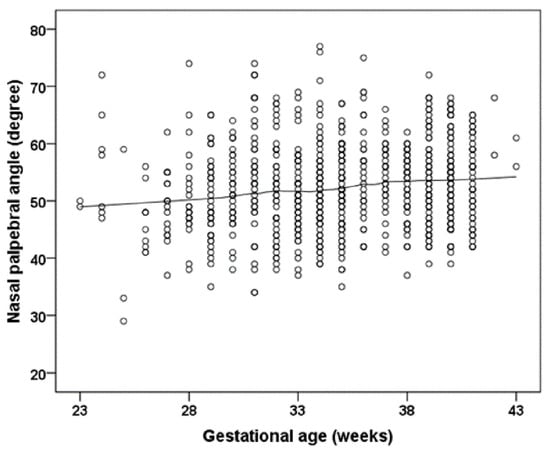 The relationship of gestational age to the nasal palpebral angle. Figure legend 3: Participants with lower gestational age reveal a smaller nasal palpebral angle. The line presents the Loess (Locally Weighted Scatterplot Smoothing) curve.