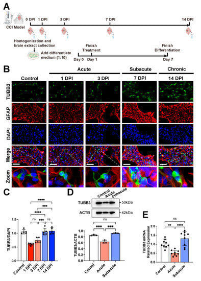 3.1. Human NSCs Differentiated a Higher Ratio of Neurons in Subacute/Chronic TBI Brain Extracts