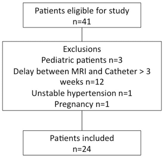 A total of 41 patients met the inclusion criteria. A total of 17 patients were excluded, mainly due to excessive delays between RHC and MRI (n = 12). The flow chart is given in Figure 1. A total of 24 patients were included for the analysis, including 9 males and 15 females aged 60 ± 14 years at time of MRI (range 20–79 years). A total of 12 patients had PH during RHC (group 1, n = 4; group 4 (CTEPH), n = 7; group 2, n = 1). A total of 12 patients had no PH during RHC (no PH, n = 3; treated CTEPH, n = 5, including four patients after pulmonary endarterectomy and one patient after balloon pulmonary angioplasty; chronic thrombo-embolic pulmonary disease (CTEPD), n = 2; and treated group 1 PAH, n = 2). The time between RHC and MRI was 6 ± 6 days (range 0–21). The patients’ details are given in Table 1.