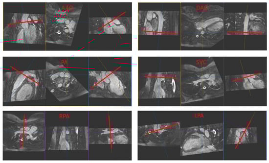 The MRI was acquired on a clinical Siemens 1.5 T AERA and 3 T PRISMA FIT (Siemens, Erlangen, Germany) and analysed using SyngoVia software from Siemens (Siemens, Erlangen, Germany). The COMRI measurements were made with flow velocity analysis in (1) AAO, (2) PA, (3) RPA + LPA, and (4) descending aorta (DAO) + superior vena cava (SVC), and the volumetric measurements were performed during the systole and diastole of (5) RV and (6) LV. The SV was then derived from the CO measurement (SV = CO/heart rate). The averaged heart rate was measured from the electrocardiogram (Siemens, Erlangen, Germany) used for the synchronisation of the MRI acquisitions. In the absence of a shunt or valvular leak, all of the 6 SVMRI estimations should reflect the same value. The images were acquired for the flow analysis using phase-contrast 2D FLASH with the image plane perpendicular to the flow direction, a slice thickness of 6 mm, and a 1.5–2 mm in-plane resolution according to the patient size, with a typical velocity encoding 250 cm/s for the aorta, 150 cm/s for the pulmonary arteries, and 120 cm/s for the superior vena cava (which was increased in the case of aliasing). The TR/TE was 28–37/2.5 ms; the flip angle was 20; the bandwidth was 450 Hz; and there were 2–3 signal averages according to the breathing pattern. For the volumetric analysis, a 2D true-FISP cine sequence was used with the following typical parameters: retrospective ECG gating, a resolution of 1.5 mm × 1.5 mm, a slice thickness of 8 mm, GRAPPA acceleration factor 3, TE of 1.3 ms, TR of 24 ms, flip angle of 30, with the left and right 2-chamber, 4-chamber, and contiguous short axes covering the whole heart.