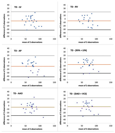 The main limitations of our study include the small number of subjects, the mildly elevated mean mPAP, the retrospective analysis, the delay between MRI and RHC, and the absence of a direct comparison to a gold standard DF. However, TD is widely used, and thus our data may be considered a comparison with a real-life setting. The strengths of our study are related to the rigorous methodology with a predetermined cut-off for the 2SD of bias, which is unfortunately rarely used in this field, and the use of new localisations for flow determination in PH, with the measurement in RPA + LPA for the pulmonary circulation and DAO + SVC for the systemic circulation.