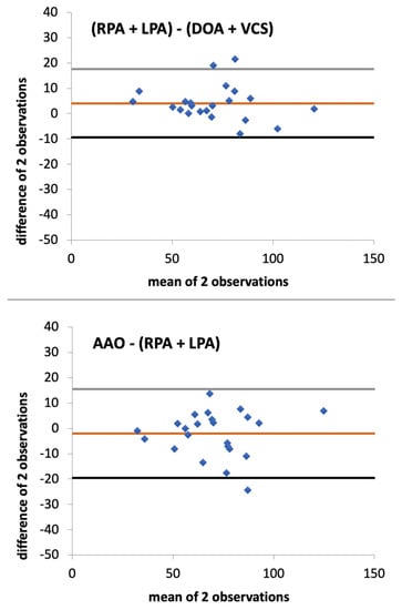 Bland and Altman analyses of SV(RPA+LPA) against SV(DOA+VCS) and SVAAO. LoA are in grey and black. Bias is in orange. Results are in stroke volume (mL/beat). AAO: ascending aorta, DAO: descending aorta, LPA: left pulmonary artery, RPA: right pulmonary artery, SVC: superior vena cava.