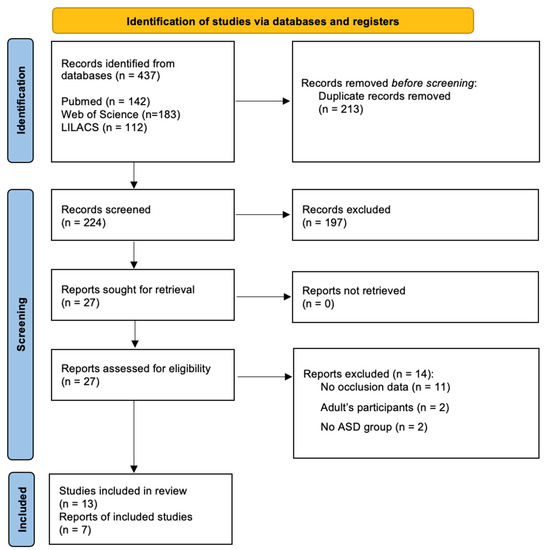 The initial dataset search retrieved 437 articles. After removing duplicates (n = 213), 197 were excluded after revising the title and/or abstract. From the overall 27 entries included for full article review eligibility, two were performed in adult populations [19,20], eleven did not report any type of malocclusion [5,21,22,23,24,25,26,27,28,29,30], and two had no ASD group of patients [9,31].