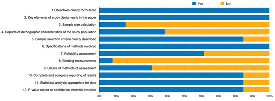 The methodological quality of the included observational and cross-sectional studies was appraised using the Joanna Briggs Institute (JBI) Critical Appraisal Checklist [14]. This tool was adapted from previously published systematic reviews. The items on the checklist were as follows: (1) clearly mention aim and justification of sample size; (2) sample randomization; (3) blind treatment allocation; (4) possibility of comparison between control and treatment groups; (5) baseline equivalence of control and treatment groups; (6) clearly describe the preparation protocol; (7) clearly report the experimental protocol; (8) measurement method and adequate statistical analysis. Each item was scored using a 2-point scale: 0—not reported or reported inadequately, and 1—reported and adequate. Any disagreements between the examiners were resolved through discussion with a third author. Studies with 12 to 11 points were considered to be of high quality, studies with 7 to 10 were of medium quality, and studies with 0 to 6 points were of low quality. For analytical cross-sectional studies, the Risk-Of-Bias VISualization (ROBVIS) tool was used as a tool to analyze the risk of bias (https://www.riskofbias.info/welcome/robvis-visualization-tool (accessed on 20 January 2022)).