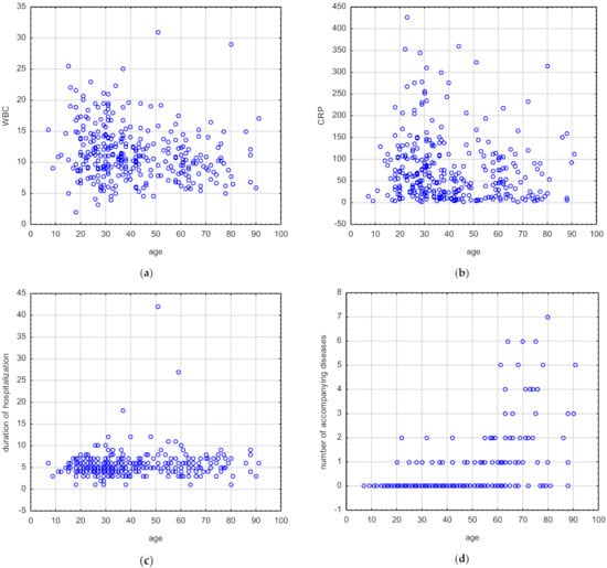 ESR and number of symptoms did not correlate with age (Table 4). BMI (rs = 0.46, p = 0.00), duration of hospitalization (rs = 0.13, p = 0.01), and number of accompanying diseases (rs = 0.51, p = 0.00) correlated positively with the patient age. In turn, WBC (rs = −0.21, p ˂ 0.001) and CRP (rs = −0.16, p ≤ 0.001) values negatively correlated with the patient age (Table 4) (Figure 1a–d, respectively).
