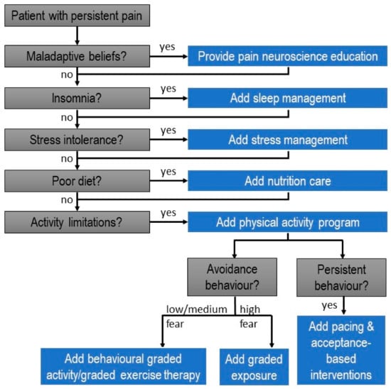 Together, this Special Issue contributes substantially to the paradigm shift towards a lifestyle approach for patients having non-ca-ncer and cancer-related chronic pain. In order to integrate the available evidence regarding lifestyle factors and chronic pain into clinical practice, clinicians can use the clinical decision-making tree for providing an individually tailored lifestyle approach for patients with chronic pain (displayed in Figure 1). It requires clinicians to screen for maladaptive beliefs as key determinants of an unhealthy lifestyle, and to address them accordingly, for instance by providing pain neuroscience education. In addition, the clinical decision-making tree guides clinicians through the main lifestyle factors for the chronic pain population, such as stress intolerance, poor sleep, poor diet and physical inactivity. If present, each of these lifestyle factors should be addressed during treatment. The resulting multimodal approach for managing patients with chronic pain implies tailoring treatment to the individual patient characteristics and therefore fits into the global move towards precision medicine [2]. Evidence supporting such a paradigm shift from a tissue- and disease-based approach towards individually tailored multimodal lifestyle interventions for chronic pain is mounting [4,12,23,25], but further study is needed. Several papers included in this Special Issue highlighted key areas for future research in this area (e.g., [4,25]). Such research efforts hold the potential to improve outcomes and decrease the psychological and socioeconomic burden of chronic pain.