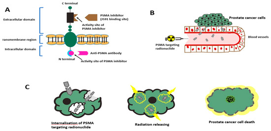 The molecular structure of PSMA and the effect of PSMA targeting radionuclide therapy to manage a PCa patient is shown in Figure 1.