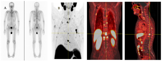 Bone and visceral lesions of PCa that may be undetected using CI can be visualized by 68Ga-PSMA–PET [71,72]. BS is the most widely used method for assessing bone metastases from PCa, with combined sensitivity and specificity of 79% and 82%, respectively [73]. The previous study of Pyka et al. revealed that 68Ga-PSMA PET was better than planar BS for the detection of affected bone regions as well as determining overall bone metastasis in PCa. Sensitivity and specificity for the overall bone involvement were from 99–100% and from 88–100% for PET, and from 87–89% and from 61–96% (p < 0.001) for BS [74].