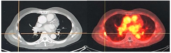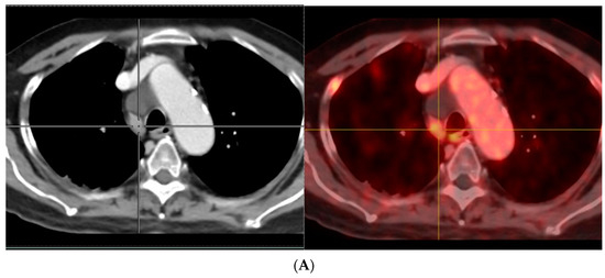 PSMA-positive mediastinal benign LNs are seen in a significant proportion of patients. PSMA-positivity on the histopathological level was associated with the activation state of the LNs. Radiotracer may be accumulated within the mediastinal LNs via the lymphatic system of the lungs. LNs with follicular hyperplasia would more likely be visible on PSMA PET imaging, as they usually present with the strongest PSMA expression. This finding is not limited to mediastinal LNs. It can occur at all body locations, and activation of LNs could lead to PSMA-positive LNs. However, it is obvious that mediastinal LNs are frequently activated, as they are often exposed to inflammatory processes derived from the lungs. Usually, the PSMA-positive mediastinal LNs show a low uptake. Indeed, the quantitative analyses revealed that PSMA-positive mediastinal LNs show significantly lower tracer uptake compared to LN metastases. Previous studies have shown that in the patients who usually present with solitary PSMA-positive mediastinal LNs, none of the patients had more than 2 PSMA-positive mediastinal LNs (Figure 5). Contrarily, LN metastases, especially in more advanced disease, often present as a chain of clearly PSMA-positive lesions. This difference can also help to distinguish metastases from PSMA-positive LNs of benign origin. In cases of uncertain grading of PSMA-positive LN, it is recommended to conduct an additional late scan (for example, at 3 h post-radiotracer injection), and most LN metastases will be associated with increasing uptake over time, while most reactive mediastinal LNs demonstrate the opposite [96].