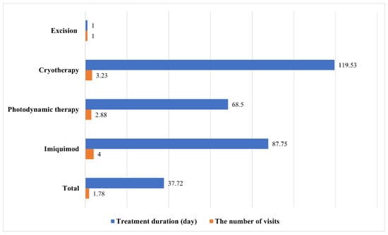 As shown in Figure 1, the average treatment period was longest for cryotherapy (119.53 days), followed by imiquimod (87.75 days), PDT (68.5 days), and excision (1 day). In terms of the number of visits for treatment, imiquimod was the highest (4), followed by cryotherapy (3.23), PDT (2.88), and excision (1).