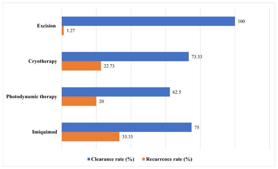 Figure 2 shows the clearance and recurrence rates of each treatment modality. Surgical excision demonstrated the highest clearance rate and the lowest recurrence rate at 100% and 1.27%, respectively. The clearance rate of cryotherapy was 73.33%, while the recurrence rate was 22.73%. In patients treated with PDT, the clearance rate was 62.5%, and recurrence was noted in 20% of the patients. Imiquimod had the second highest cure rate, but one of three patients whose lesions were cleared experienced relapse.