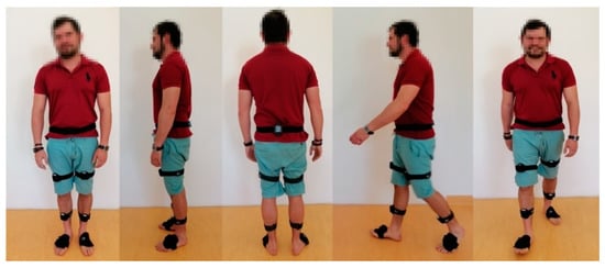 Following the manufacturer’s instructions, Noraxon MyoMOTION System inertial sensors were placed on the sacrum, on the thigh (anterior part of the quadriceps muscle, 3–5 cm above the kneecap), on the leg (on the front side, halfway between the ankles and the kneecap), and on the foot (on the dorsal side, slightly below the ankles) (Figure 1). All sensors were attached by the same technician with elastic adhesive tape and special strips (each strap had a pocket for an inertia sensor). Calibration was performed in a vertical position in order to determine the value of the 0° angle in the joints. The angle values were recorded with an accuracy of 0.1° and analyzed statistically.