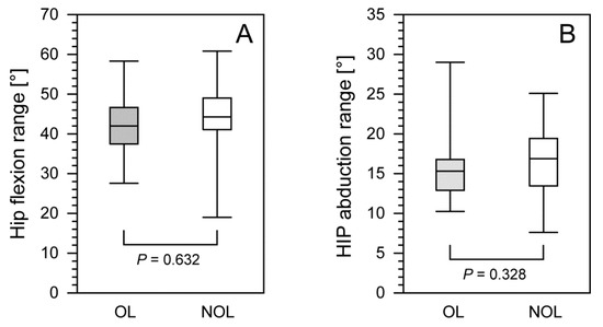 We observed no significant differences in hip flexion (i.e., minimum, maximum, or range), hip abduction (i.e., minimum, maximum, or range) (Table 1), or knee flexion (i.e., minimum, maximum, or range) (Table 2) between the OLs and NOLs in patients after treatment with the Ilizarov method. Furthermore, 24–48 months after Ilizarov treatment, we compared the OLs and NOLs in terms of the ranges of hip flexion (p = 0.632), hip abduction (p = 0.328) (Figure 2), and the knee flexion (p = 0.809) (Figure 3).