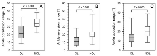 We found significant differences in minimum and maximum ankle dorsiflexion (p = 0.011, p < 0.001), ankle inversion (p = 0.011; p = 0.005), and minimum ankle abduction p = 0.004 (Table 3).