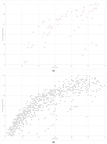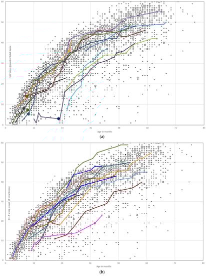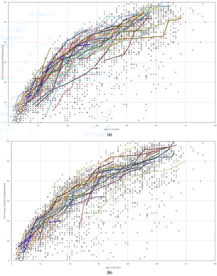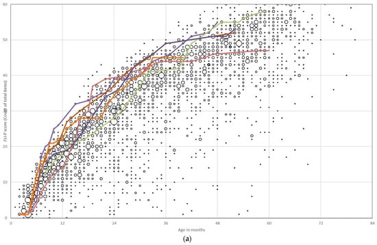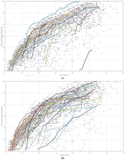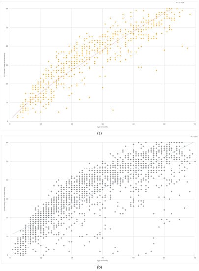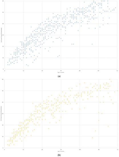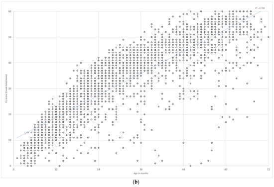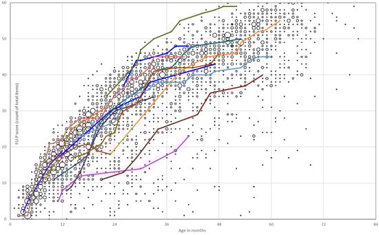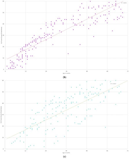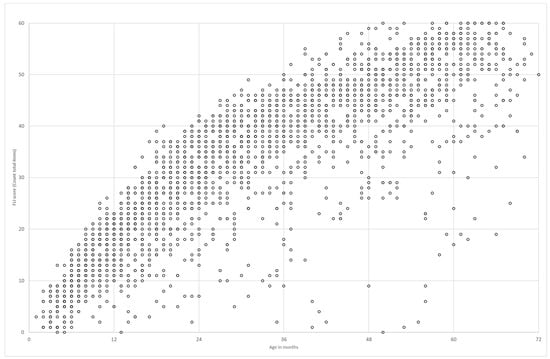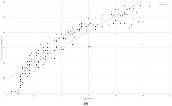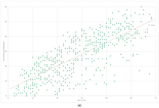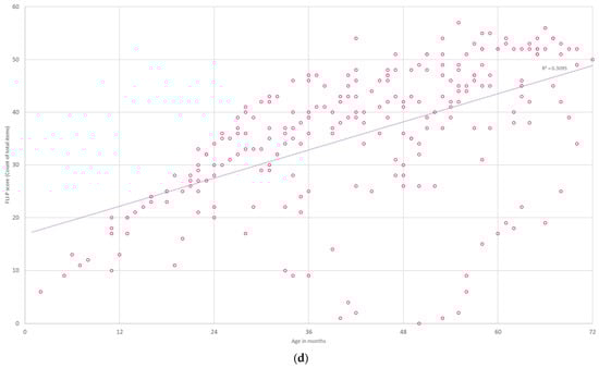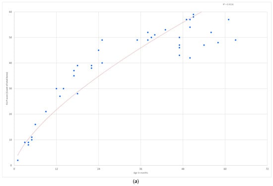 Group data of children’s FLI-P scores were aggregated to determine if the expected differences were observed between the FLI-P scores for children in the EI group to the FLI-P scores for children in the TH group. There were 46 FLI-P results collected for 27 children in the TH group, and the age at data collection ranged from 2 to 63 months (average age 32 months). A single FLI-P result was collected for 20 children, 2 data points for four children and 3, 5, and 10 data points for the other three children in the group. The lowest FLI-P score for the TH group was 2 items at 1 month of age, and the highest score was 49 items (of the 60 in total) at 63 months of age. The FLI-P results for the TH group are graphed against age in months in Figure 6. A line of best fit indicates significant correlations over time ( = 0.92).