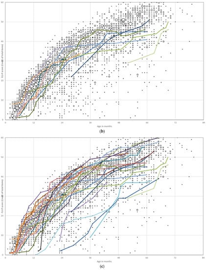 Individual listening trajectories of FLI-P scores of children with bilateral profound hearing loss who received their first cochlear implant (a) under 6 months of age; (b) between 6 and 11 months of age; and (c) between 12 and 23 months of age. Scores show a steep increase in skills post implantation and ongoing acquisition with age. Each of the colored lines represents an individual child’s trajectory to highlight progress and different listening development trajectories.