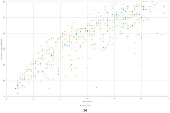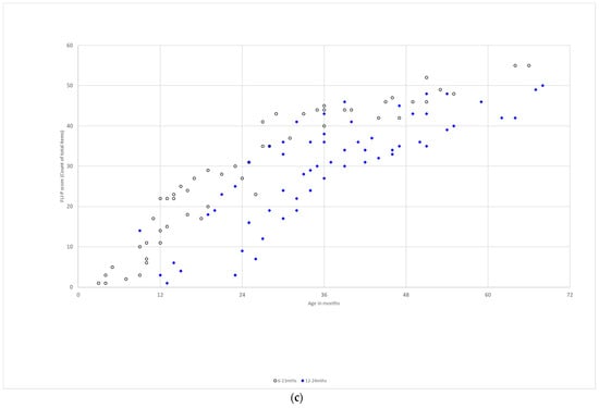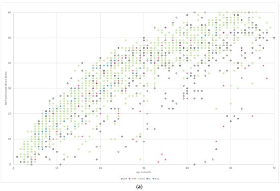FLI-P scores (a) bilateral ANSD (no color) vs. unilateral ANSD (colored dots); (b) bilateral ANSD (no color) vs. unilateral ANSD (colored dots), no additional development needs; and (c) bilateral ANSD with a CI between 6 and 11 months (n = 5) (no color) and 12 and 23 months (n = 6) (colored dots).