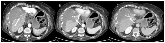 With regard to patients, both HCC patients and colorectal liver metastases patients [105,106,107,108,109,110,111,112,113] could have impaired liver function due to cirrhosis or drug-induced liver injury [114], so, they are at increased risk of bleeding (Figure 1) or biliary damage (Figure 2). In addition, in immunocompromised patients, the risk of infection of the ablated area is high, with consequent risk of liver abscess [115,116,117,118,119,120,121,122,123,124].