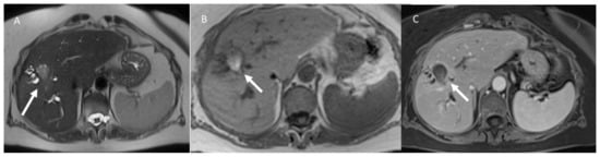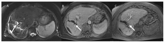 Woman 58 years at 1-month follow-up after microwave ablation of liver metastasis. MRI assessment (A) half-Fourier acquisition single-shot turbo-spin-echo (HASTE) T2-weighted sequence; in phase T1-weigthed sequence pre (B,C) post contrast assessment: ablated zone with biliary tree damage (arrow).