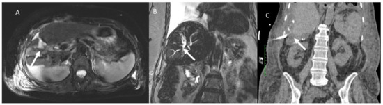 Woman 58 years at 1-week follow-up after microwave ablation of liver metastasis. MRI assessment. (A) Sampling perfection with application optimized contrasts using different flip angle evolution (SPACE) T2-weighted fat sat sequence in axial plane and (B) SPACE T2-weighted fat sat sequence in coronal plane, arrow shows biloma. In (C) CT evaluation (multi-planar reconstruction coronal plane) of biloma drainage (arrow).