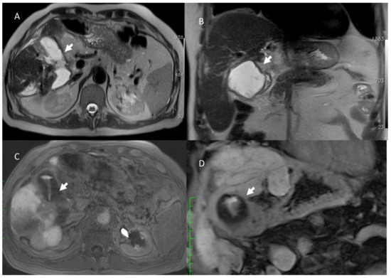 Treatment of lesions in the central liver near large biliary ducts may predispose patients to clinically significant biliary stricture formation, while biliary strictures of the peripheral segmental bile duct may not require any treatment [126]. A bile leak could occur as a result of direct injury; the formation of biloma increases the risk of secondary infection and hepatic abscess. MRI with both MR cholangiopancreatography (MRCP) and study with hepatospecific contrast (EOB) is the imaging choice to localize bile leaks.