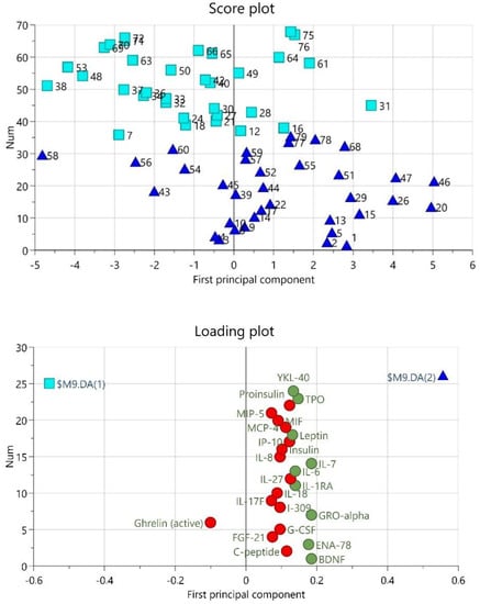 A separate OPLS-DA was done to see if any of the proteins differed between MYA and MFP. A significant model with one predictive model was found also here (R2 = 0.499, Q2 = 0.224, CV-ANOVA p-value = 0.019). In this model 12 proteins (BDNF, Eotaxin, Eotaxin-3, Ghrelin (active), GLP-1 (total), GRO-alpha, IL-5, IL-7, IP-10, MCP-2, MCP-4, and TARC) separated the groups with a VIP > 1.0 and p(corr) > 0.40. Ghrelin (active) and GLP-1 (total) were lower in MYA, all the others were higher in MYA compared to MFP (Table 4).
