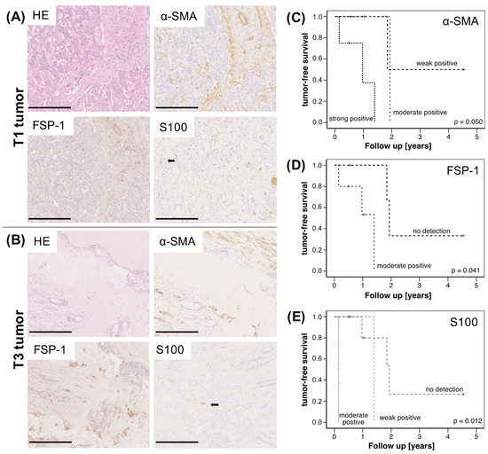 Immunohistochemical analysis of CCA specimens and correlation with survival of CCA patients. (A) Representative HE stainings and stainings for α-SMA, FSP-1 and S100 in pT1 N0 (scale bar = 250 µm) and (B) pT3 N0 (scale bar = 500 µm) CCA specimens. Kaplan–Meier plots for tumor-free survival of CCA patients depending on (C) α-SMA, (D) FSP-1- and (E) S100-expression; (n = 14 CCA, thereof 5 with intrahepatic and 9 with extrahepatic tumors). Statistical significances are indicated in the figure.