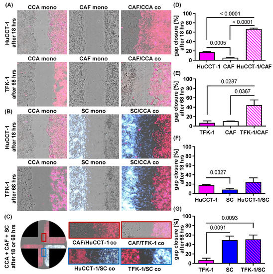Importantly, gap closure was most pronounced when either CCA cell line was co-cultured with stromal cells, albeit clear differences were observed in dependence on the stromal cells (Figure 2A,B,D–G). While in the co-culture of CCA cells and CAF, the gap was closed predominantly by migration of CCA cells (Figure 2A), gap closure during co-culture of CCA cells and SC was predominantly mediated by the migration of SC cells towards CCA cells (Figure 2B). This migratory behavior was also not changed when CCA cells were concomitantly exposed to CAF and SC (Figure 2C). In HuCCT-1 co-cultures, gap closure was significantly more pronounced in the presence of CAF (p < 0.0001) than SC (p = 0.4489; 66.9% gap closure after CAF co-culture versus 24.8% after SC co-culture, Figure 2D,F), while in TFK-1 co-cultures, gap closure was slightly more pronounced in the presence of SC after 18 h (p = 0.0083) but comparable in the presence of CAF (p = 0.0287; 44.7%) and SC (p = 0.0093; 50.1%) after 68 h (Figure 2E,G). Overall, these data indicate that cell migration of CCA cells is enhanced in the presence of CAF, while the presence of CCA cells, in turn, increases cell migration of SC.