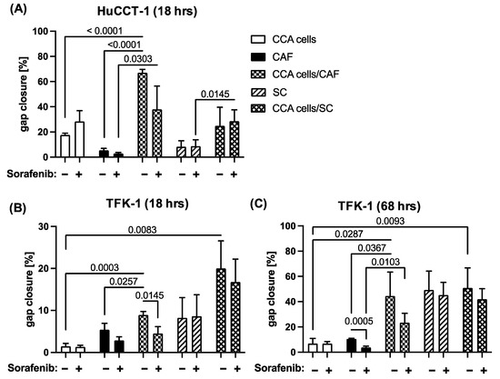 Since the multityrosine kinase inhibitor Sorafenib has already shown growth inhibitory effects on CCA cells [7], we next investigated whether Sorafenib might be also able to inhibit cell migration of CCA cells and different stromal cells. Since a dosage of 1 µM has been shown to hardly impact the cell growth of neither CCA cells nor both stromal cell populations (data not shown), mono- and co-cultures of CCA cells, CAF and SC, respectively, in the absence or presence of 1 µM Sorafenib were conducted to analyze gap closure. As seen in Figure 3A, Sorafenib treatment even intensified cell migration of mono-cultured HuCCT-1 cells, leading to an increased gap closure from 17.5% to 28.2%, while cell migration of mono-cultured CAF was clearly diminished after 18 h (from 5.4% to 2.9%, p = 0.0668, Figure 3A,B) and even more pronounced after 68 h (from 10.5% to 3.8%, p = 0.0005, Figure 3C). Furthermore, a clear reduction in cell migration was observed in co-cultures from HuCCT-1 cells and CAF (from 66.9% to 38.0%, p = 0.0548). In contrast, gap closure by mono-cultured SC after 18 h (8.2% versus 8.6%, Figure 3A,B) and after 68 h (49.3% versus 45.2%, Figure 3C) as well as HuCCT-1 co-cultures with SC (from 24.8% to 28.5%; Figure 3A) remained nearly unaffected. Similar observations could be made with TFK-1 cells. Here, Sorafenib treatment also did not impact cell migration of mono- and co-cultured CCA cells with SC (Figure 3B,C). In line with the results described for HuCCT-1 cells and mono-cultured CAF, a clear inhibitory effect on cell migration could only be observed on co-cultures of CAF and TFK-1 cells, leading to a reduced gap closure from 8.9% to 4.5% (p = 0.0145) and from 44.5% to 23.4% (p = 0.1489) after 18 h and 68 h, respectively (Figure 3B,C). Overall, these data indicate that Sorafenib treatment impairs the migratory abilities of CAF and CCA cells but not SC. The fact that particularly the co-culture increased cell migration of CAF and CCA cells was affected point to a Sorafenib-mediated inhibition of paracrine interactions between tumor cells and CAF.
