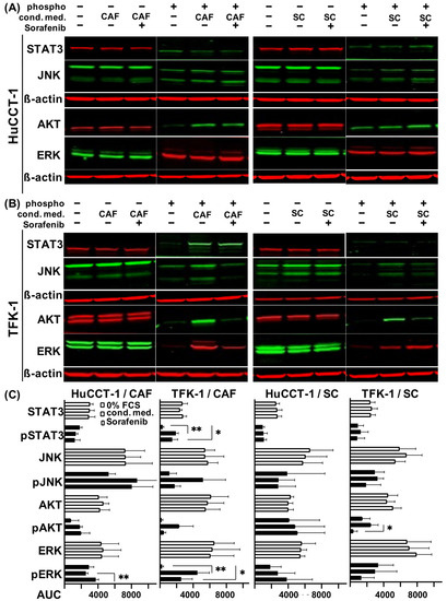 Impact of CAF and SC on signaling pathways in CCA cells in the absence or presence of Sorafenib. (A) HuCCT-1 cells and (B) TFK-1 cells were initially cultured in 0% FCS medium for 24 h with additional Sorafenib treatment for another 24 h where appropriate. The following day, cells were treated for 15 min in unconditioned medium or in conditioned medium from CAF or SC, which was either left untreated or supplemented with 1 µM Sorafenib beforehand. Shown are representative blots out of three replicates demonstrating expression levels of the phosphorylated and total forms of STAT3, JNK, AKT and ERK. ß-actin was determined in parallel as control. (C) Quantifications of fluorescence signals of the detected total and phosphorylated signaling proteins are demonstrated as area under the curve (AUC). Bars represent from top to bottom unconditioned medium, treatment with conditioned medium and Sorafenib treatment. Significances were defined using asterisks: * p < 0.05, ** p < 0.01.