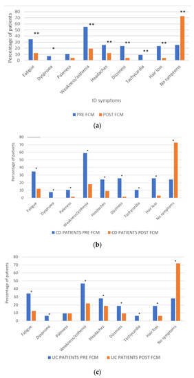 (a) Effect of FCM on self-reported ID symptoms; * p < 0.05; ** p < 0.01 (McNemar test). (b) Effect of FCM on ID symptoms patients with CD; * p < 0.05 (McNemar test) (c) and UC; * p < 0.05 (McNemar test).