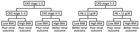 Hung, C.-C.; Yu, P.-H.; Niu, S.-W.; Kuo, I.-C.; Lee, J.-J.; Shen, F.-C.; Chang, J.-M.; Hwang, S.-J. Association between Body Mass Index and Renal Outcomes Modified by Chronic Kidney Disease and Anemia: The Obesity Paradox for Renal Outcomes. J. Clin. Med. 2022, 11, 2787. https://doi.org/10.3390/jcm11102787