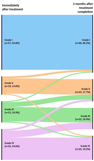 The alluvial diagram showed the distribution of the recovery grade from immediately after the treatment (left nodes) to 2 months after treatment completion (right nodes).