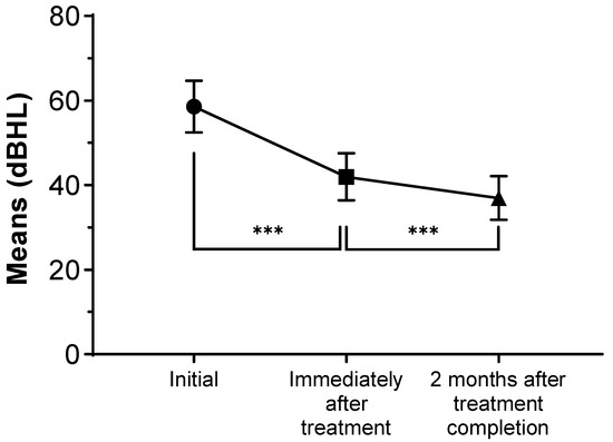 The hearing level was assessed using a pure-tone audiogram before treatment, immediately after treatment, and 2 months after treatment completion. The pure-tone average was defined as the mean value of the measurements taken at the 500, 1000, 2000, and 4000-Hz frequencies. When the hearing thresholds were undetectable, a fixed value of 120 dB was applied.