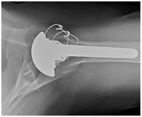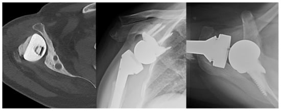 - Dilisio, M.F.; Miller, L.R.; Siegel, E.J.; Higgins, L.D. Conversion to Reverse Shoulder Arthroplasty: Humeral Stem Retention Versus Revision. Orthopedics 2015, 38, e773–e779. [Google Scholar] [CrossRef]