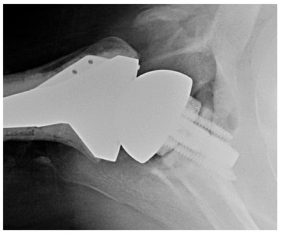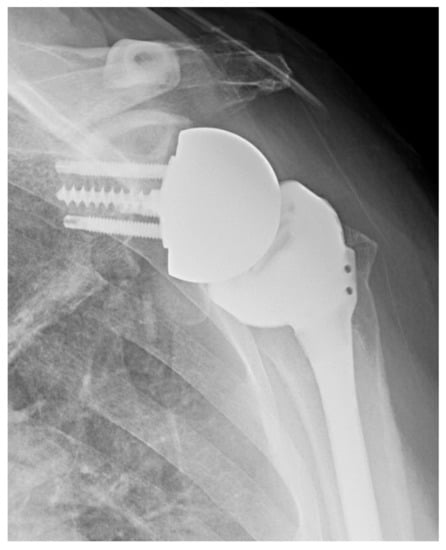 - Leonidou, A.; Virani, S.; Buckle, C.; Yeoh, C.; Relwani, J. Reverse shoulder arthroplasty with a cementless short metaphyseal humeral prosthesis without a stem: Survivorship, early to mid-term clinical and radiological outcomes in a prospective study from an independent centre. Eur. J. Orthop. Surg. Traumatol. Orthop. Traumatol. 2020, 30, 89–96. [Google Scholar] [CrossRef]