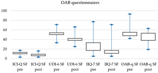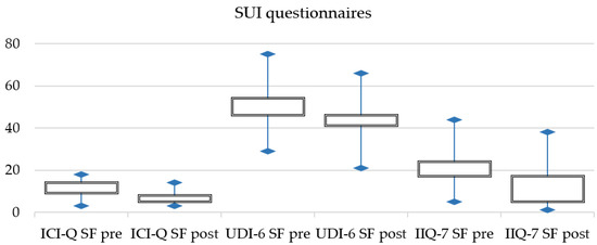 Furthermore, statistically significant differences were found between patients’ reported outcomes pre- and post-procedure. Post-treatment questionnaires scores were lower than pre-treatment scores for both SUI and OAB symptoms (Table 4).
