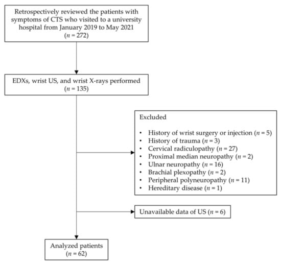This study was designed as a retrospective chart review. We collected the data of 68 patients between January 2019 and May 2021. The patients who visited the outpatient department of rehabilitation medicine in a single center with some or all symptoms of CTS and underwent EDXs, wrist US, and wrist simple X-rays were selected for the study. The symptoms were sensory abnormalities in median nerve distribution, nocturnal pain, atrophy in the thenar region, and several positive provocative tests (Tinel sign, Phalen’s maneuver, and reverse Phalen’s maneuver) [,,]. The exclusion criteria were as follows: (1) Patients with a history of wrist surgery or injections and any upper extremity trauma; (2) patients with neurologic diseases, such as diabetic polyneuropathy, brachial plexopathy, ulnar neuropathy, proximal median neuropathy (entrapment of the ligament of Struthers, pronator syndrome, anterior interosseous nerve syndrome), cervical radiculopathy, and rheumatic diseases; and (3) patients with hereditary or metabolic diseases that can cause peripheral neuropathy. Six patients were excluded due to insufficient wrist images. Finally, 97 wrists of 62 patients were enrolled in this study (Figure 1). The study was approved by the Institutional Review Board of Konyang University College of Medicine (IRB no. 2021-06-010).