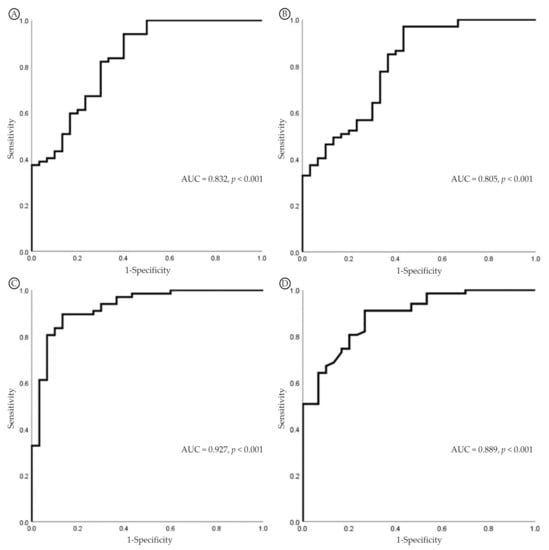 The OR and 95% CI in univariate logistic regression of the four imaging features adjusted for baseline age values are presented in Table 7. Neither UV (p = 0.05, OR 1.43, 95% CI 1.00–2.04) nor APDW (p = 0.237, OR 1.16, 95% CI 0.91–1.48) were significantly related to CTS. However, the FR (p < 0.001, OR 86.52, 95% CI 9.26–808.83) and the TAPDM (p < 0.002, OR 15.33, 95% CI 2.78–84.62) were significantly associated with CTS. The ROC curves are shown in Figure 3. The area under the curve (AUC) of the UV and the APDW was 0.832 (p < 0.001) and 0.805 (p < 0.001), respectively. The AUC of the FR and the TAPDM was 0.927 (p < 0.001) and 0.889 (p < 0.001), respectively. Table 7 also shows the multiple logistic regression analysis results using backward elimination. The FR (p = 0.001, OR 52.52, 95% CI 5.50–501.73) and the TAPDM (p = 0.032, OR 8.91, 95% CI 1.20–65.97) were significant variables, so they remained in the model.
