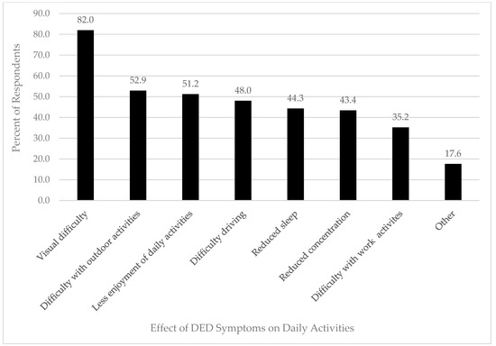 Eighty-two percent of respondents reported difficulty with vision (Figure 1). Respondents reported difficulty with performing outdoor activities (52.9%), reading (51.2%), driving (48.0%), activities involving concentration (43.4%) and work-related activities (35.2%) due dry eye symptoms. Forty-four percent of respondents reported that dry eye symptoms interfered with sleep, and half of respondents reported diminished enjoyment in daily activities.