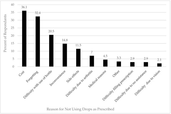 Cost of therapy was the most commonly reported reason (36.1%) for missing doses of artificial tears and prescription drops. Other reasons reported were: forgetting to instill doses (32.4%), difficulty administering drops from the bottles (20.5%), inconvenience (14.8%), and side effects from drops (11.5%) (Figure 2). Examples of free-text responses from participants relating to non-adherence are presented in Appendix B, question 15.