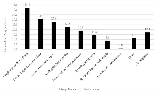 Drop-rationing employed to reduce the cost of therapy was reported by 82.9% of respondents. Drop rationing strategies included using single-use vials more than once, which was reported by 41.8% of respondents. Other strategies included using drops past the expiry date (27.9%), using fewer drops per day than prescribed (30.3%), and requesting free samples from eye care providers (22.5%) (Figure 3). Of the 213 patients who were advised to use preservative-free artificial tear drops, 84.5% were using a drop-rationing technique to reduce the financial impact of therapy. Comparatively, of the 30 patients who reported not being advised to use preservative-free drops, 73.3% were using a strategy to ration their preserved artificial tear drops (p = 0.19). One respondent did not disclose whether they were advised to use preserved or preservative-free artificial tears. Examples of free-text responses relating to drop rationing strategies are shown in Appendix B question 16.